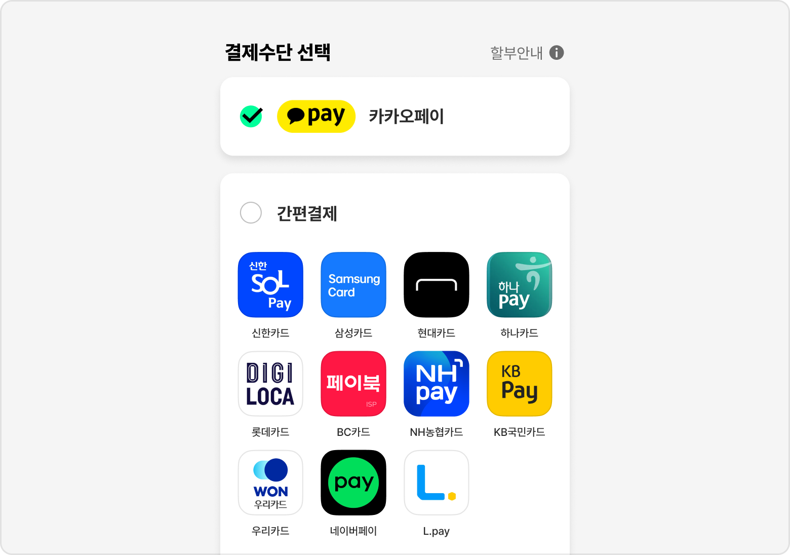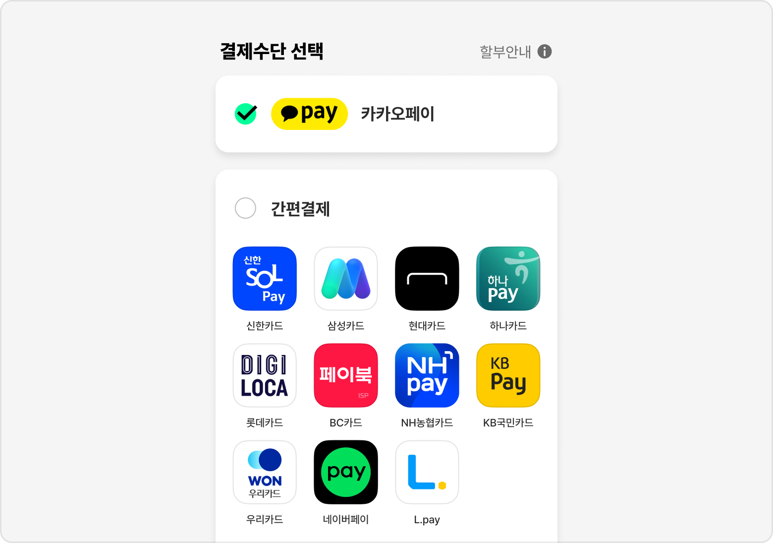 간편결제는 카드나 계좌 정보를 미리 등록해 두고, 비밀번호나 지문 등으로 간단하게 결제할 수 있는 결제수단입니다. 또한, 카드 정보가 스마트폰에 내장되어 있지 않고 해당 금융사 서버에 보관되어 안전합니다.