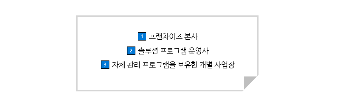 프랜차이즈 본사는 하위가맹점을 대상으로 다양한 관리프로그램을 제공하고 있습니다. 그리고 하위가맹점은 본사의 관리프로그램을 통해 회원관리와 본사물품구매 등의 기능을 사용하고 있습니다.