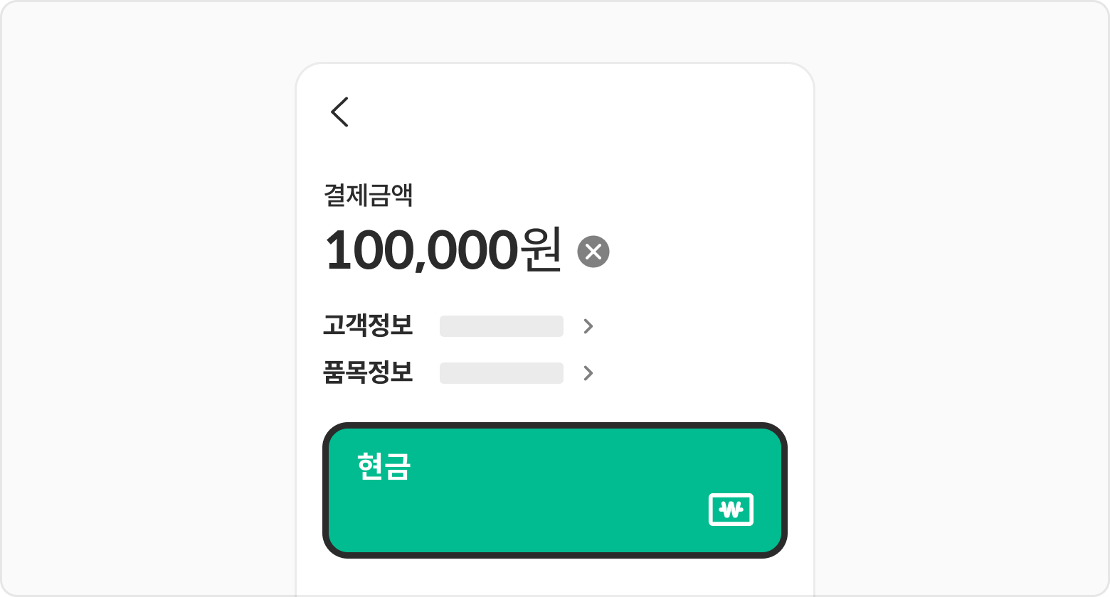 결제금액, 고객정보, 품목정보를 입력한 뒤 현금 버튼을 선택해 주세요.