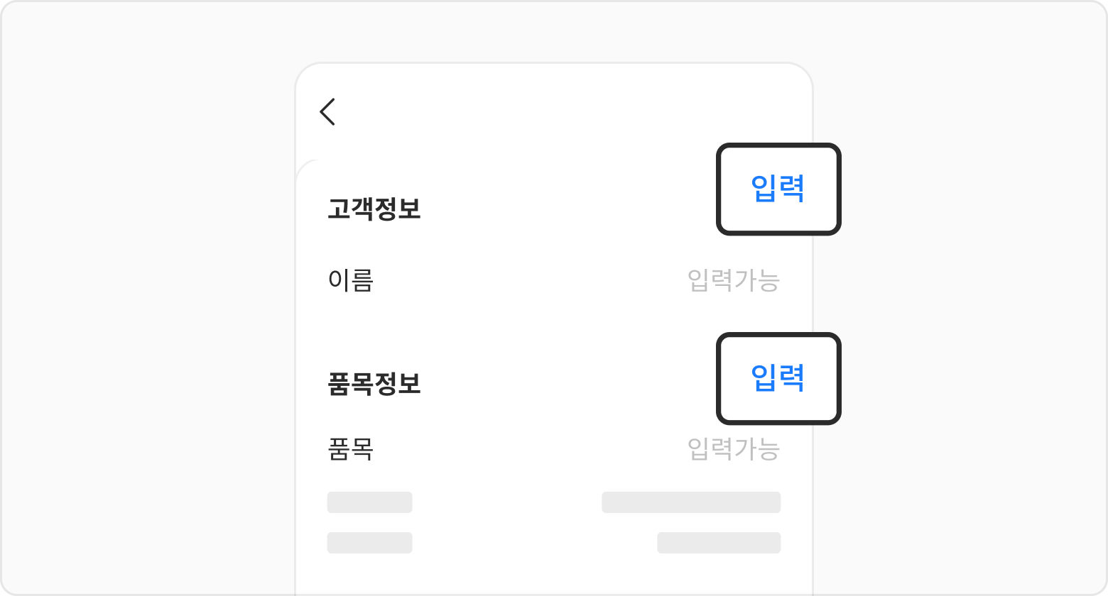 고객정보, 품목정보 우측 상단에 있는 입력 버튼을 선택해 주세요.