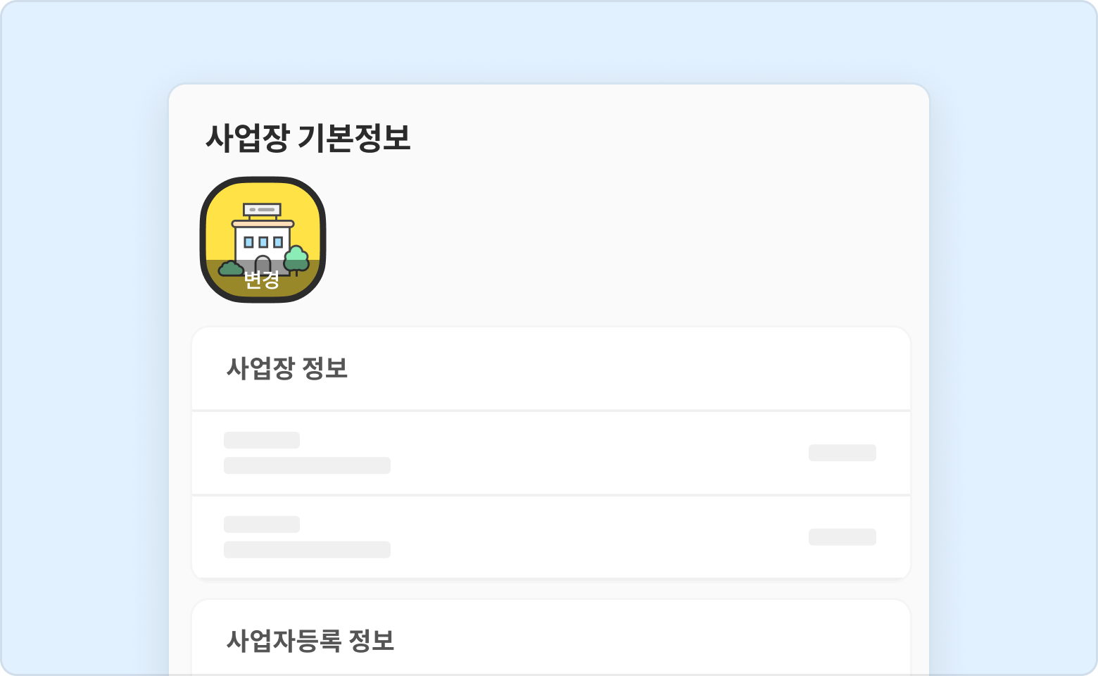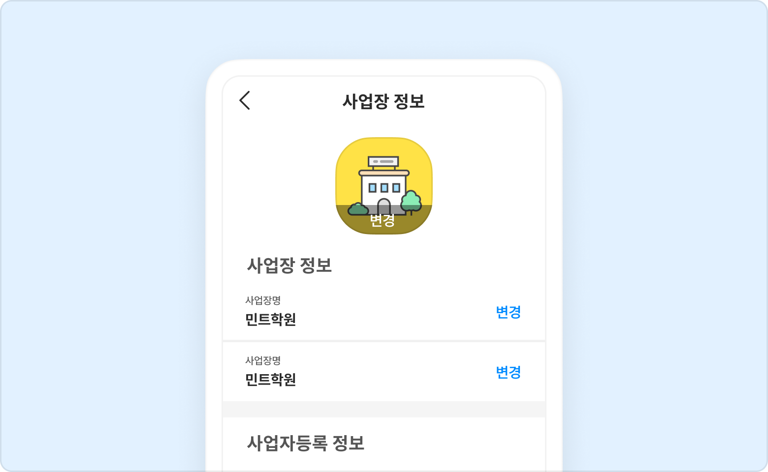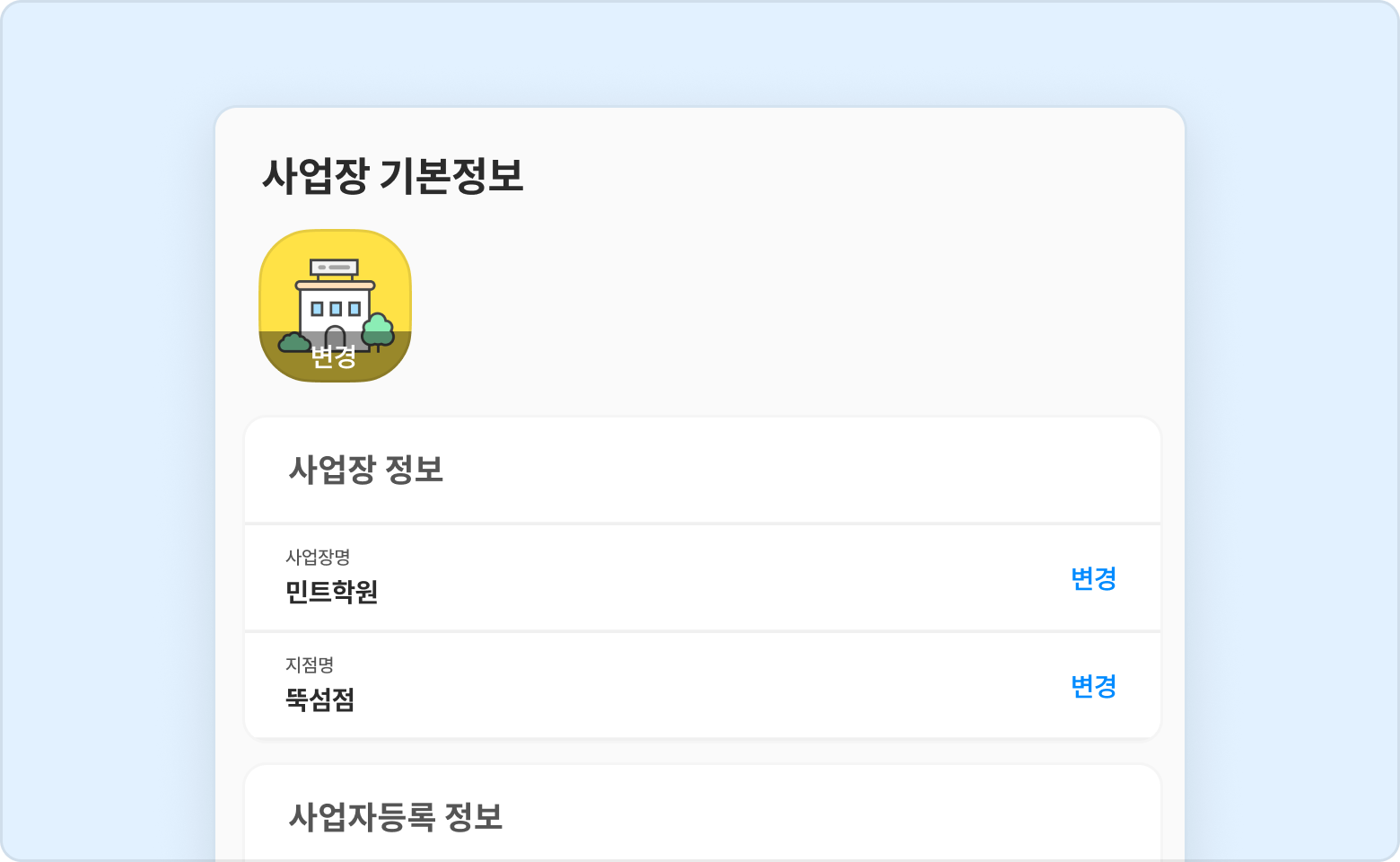 메뉴 > 사업장 정보 에서 변경이 필요한 정보를 수정해 주세요.