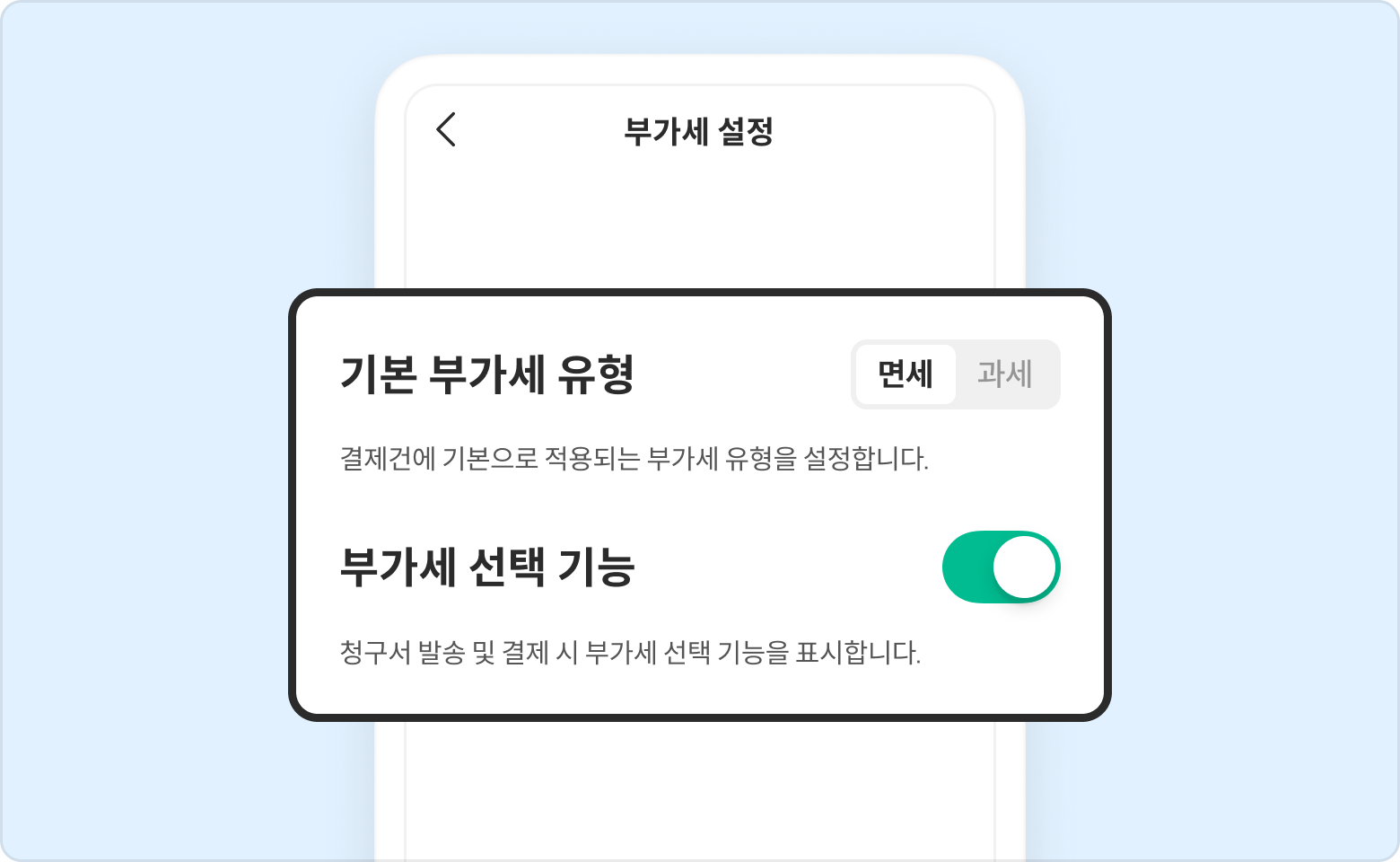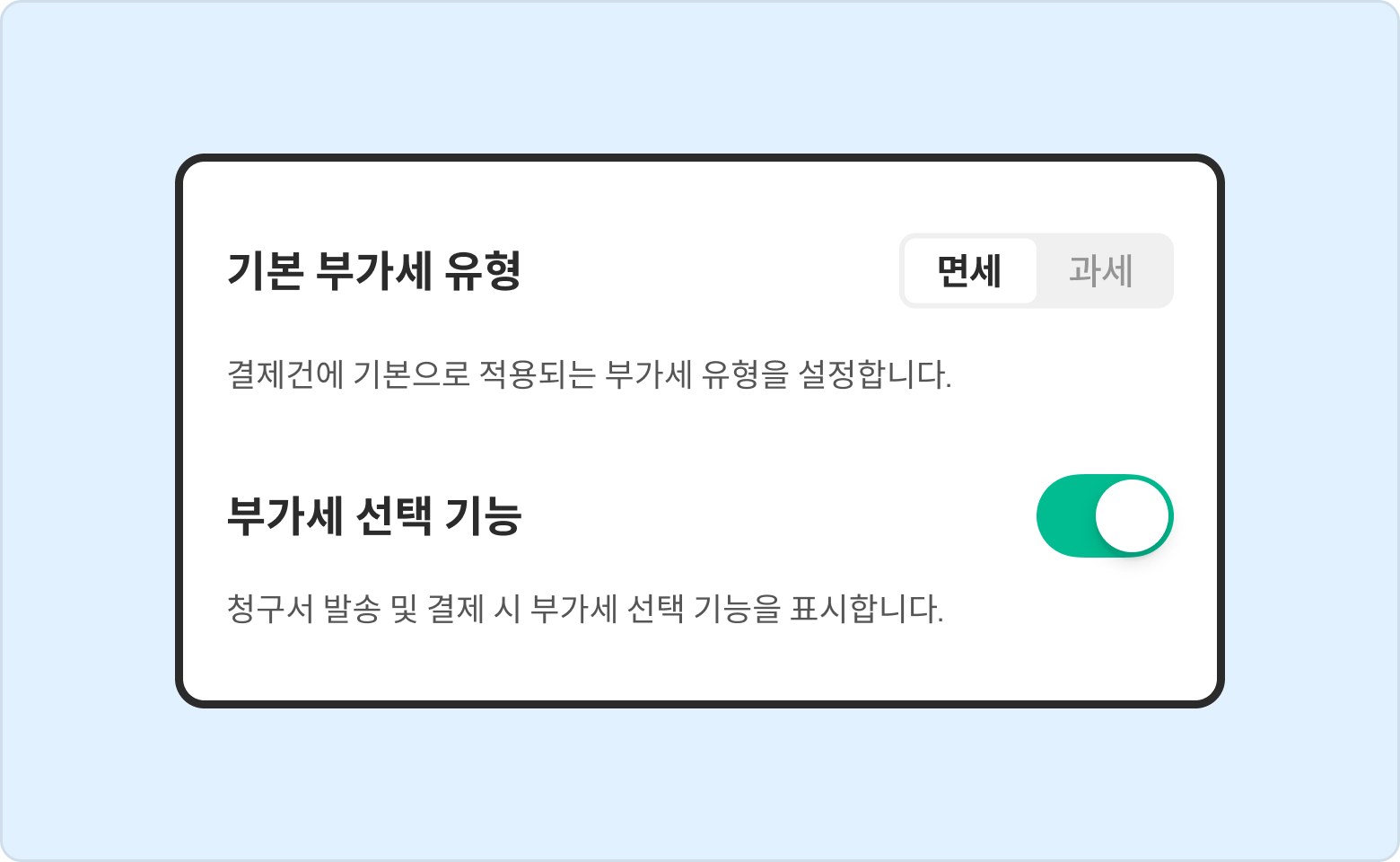 청구서 발송 및 결제 시 부가세 선택 기능의 표시 여부를 설정해 주세요.