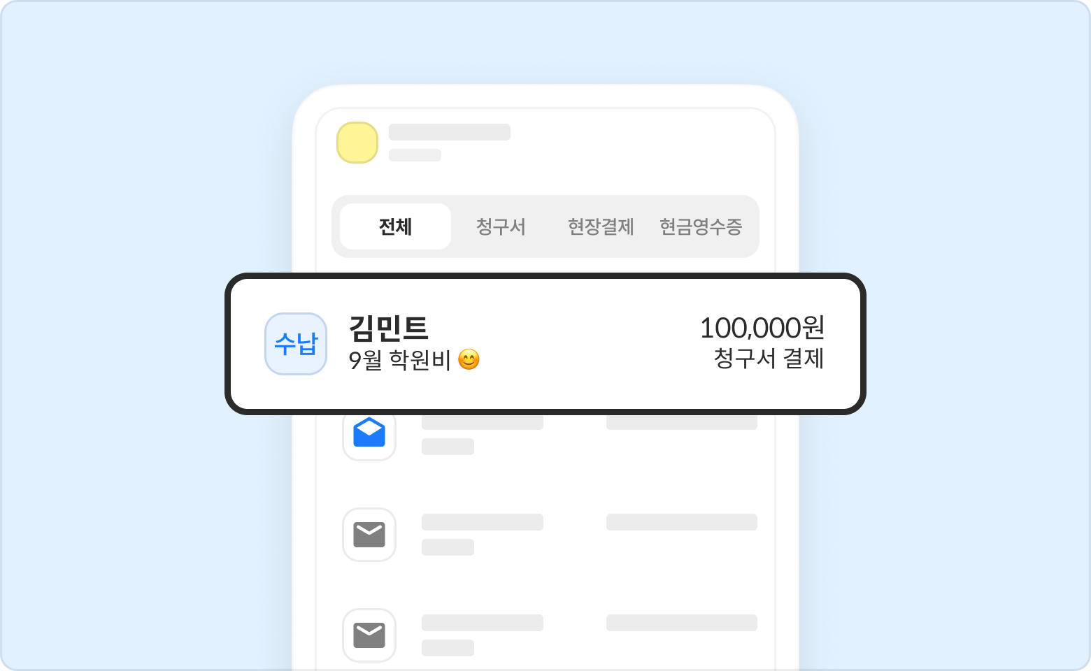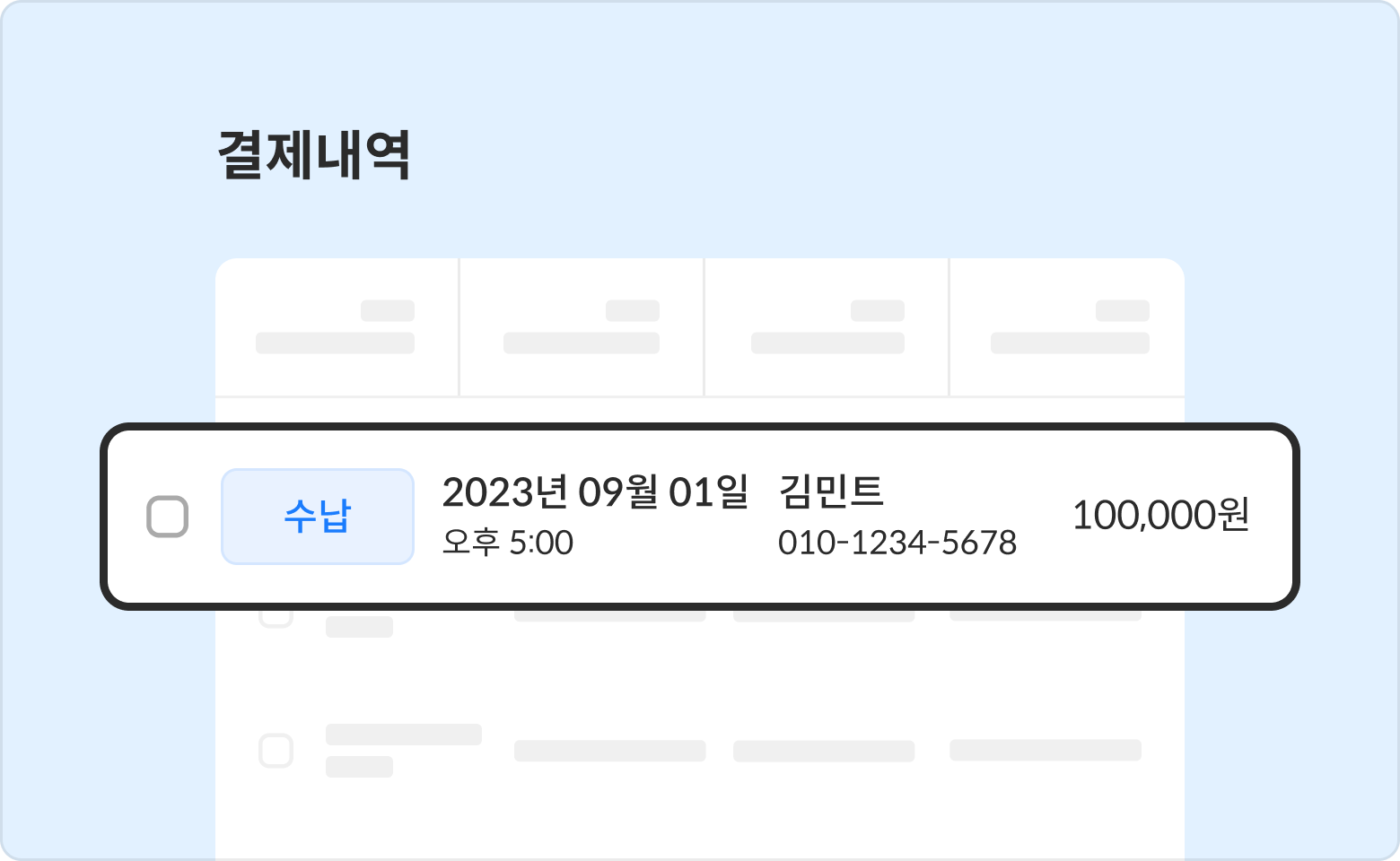 결제내역 화면에서 결제취소를 원하는 청구서를 클릭해 주세요.