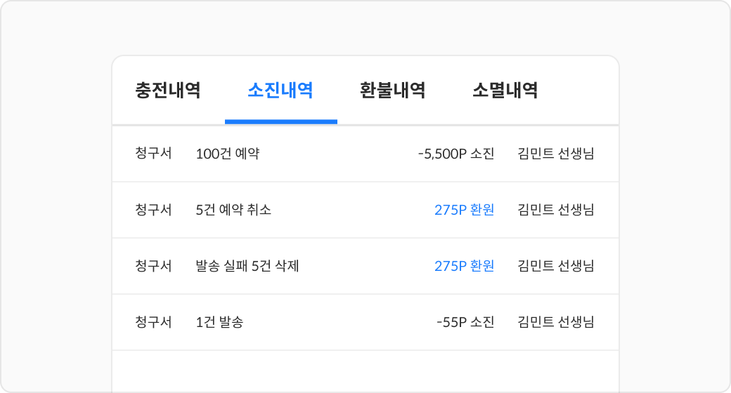 우측 상단에 발송톡 사용 내역 버튼을 클릭하면 사용내역을 확인할 수 있습니다.