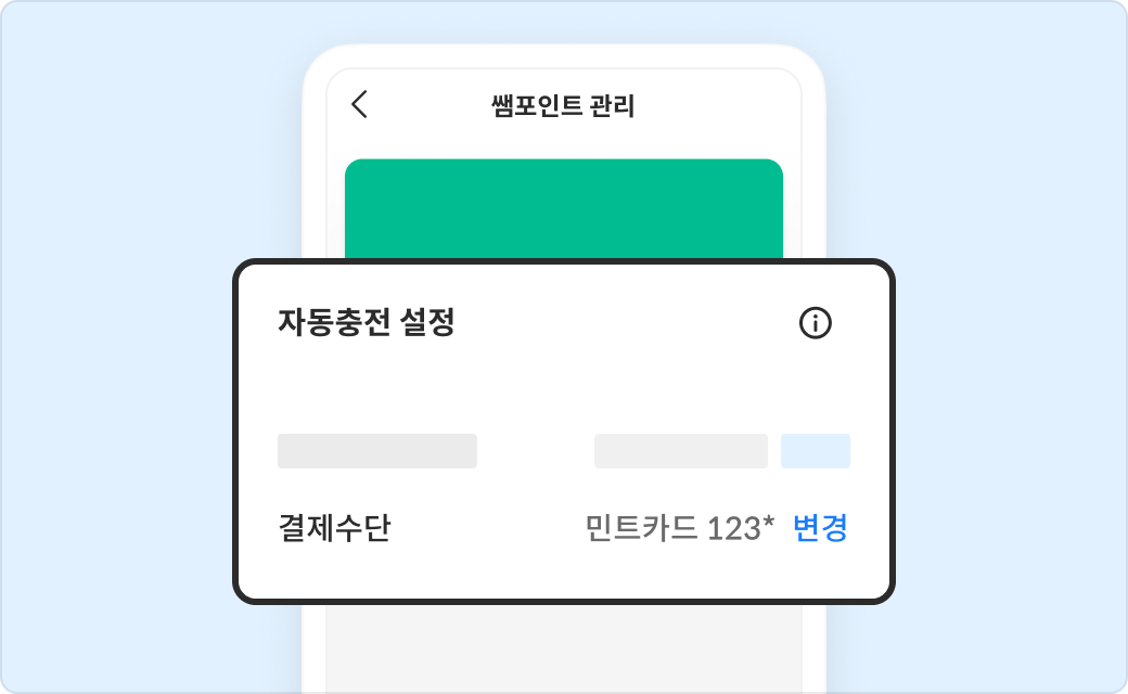 홈>쌤포인트> 쌤포인트 관리>자동충전 설정 > 결제수단 우측의 변경 버튼을 선택해 주세요.