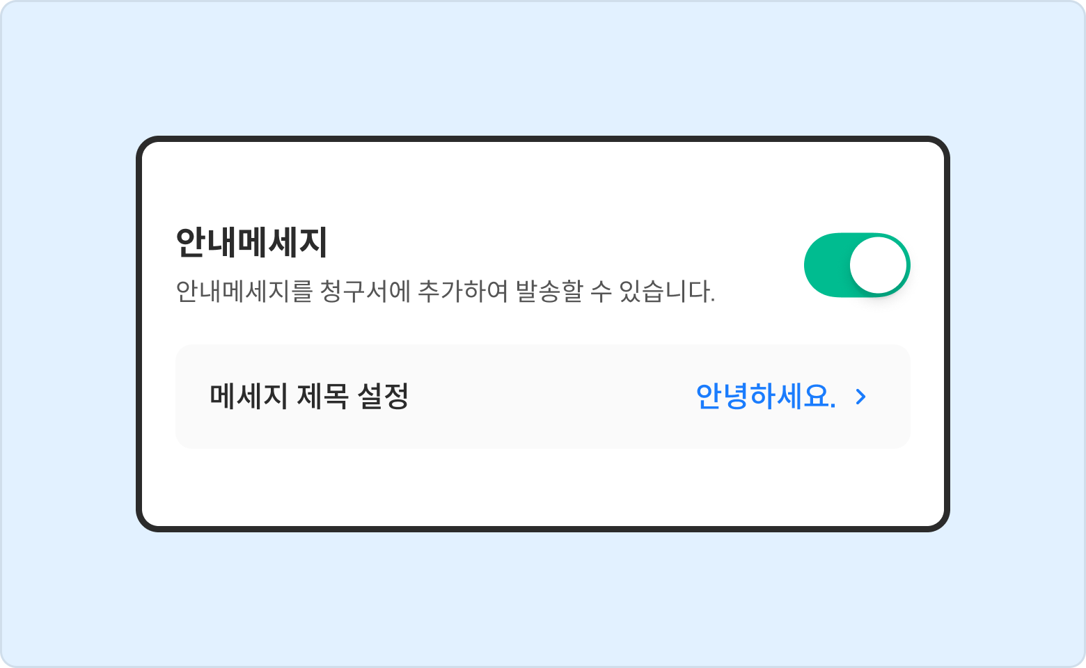 스위치 버튼을 활성화 시켜 사용상태로 변경해 주세요.메시지 제목 설정을 클릭하면 메시지 제목을 설정할 수 있습니다. (*10자까지 가능)