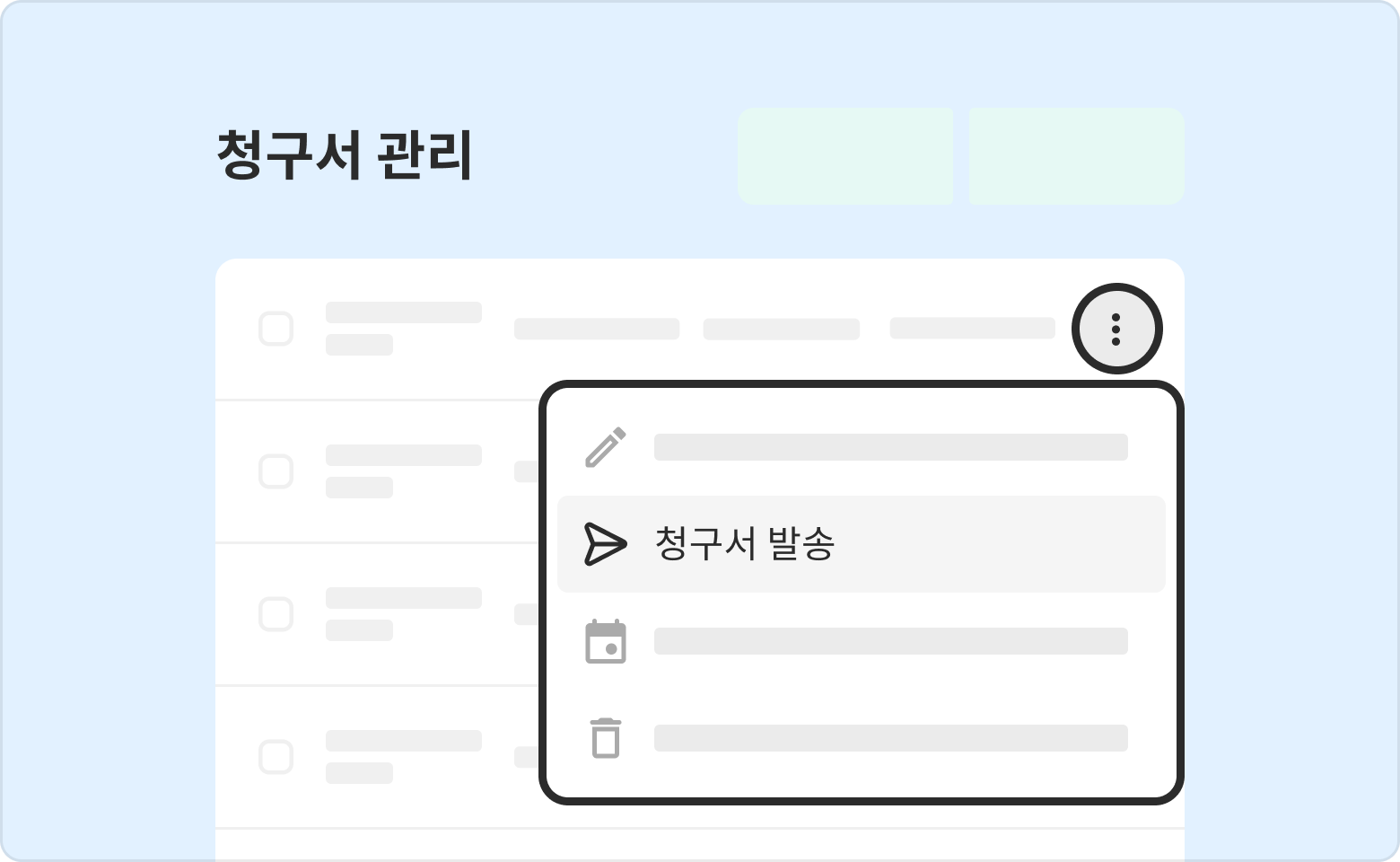 1️⃣ 발송할 청구서 우측의 더보기 버튼을 클릭 후 청구서 발송 버튼을 클릭해 주세요.