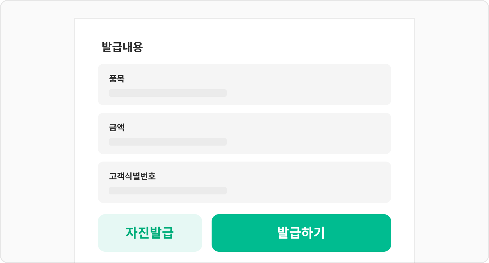 품목정보 없이 결제금액만 입력해도 발급이 가능하며, 이후 결제내역 상세에서 직접 추가 및 수정이 가능합니다. 고객/품목 정보 관리하기(바로가기→) 문서를 확인해주세요.