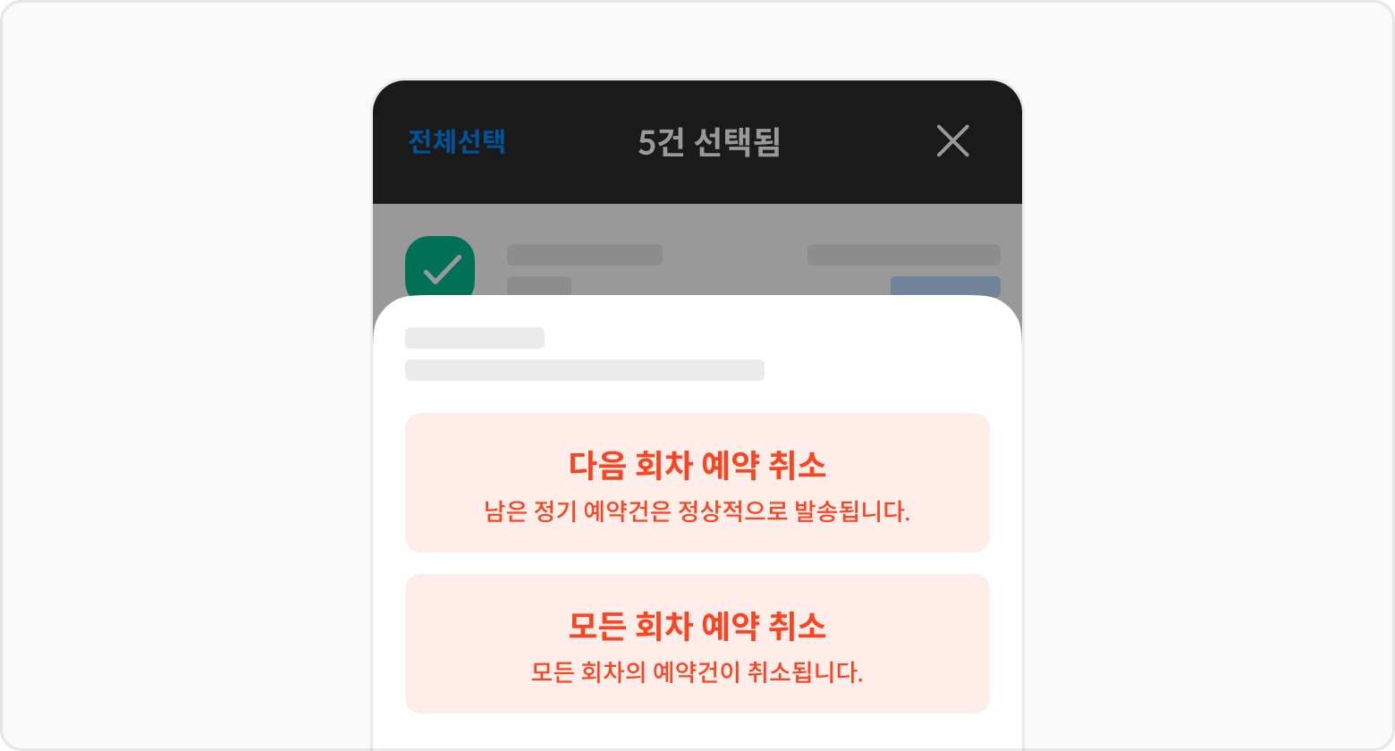선택한 정기예약건의 다음 회차 예약만 취소되고 남은 정기예약건은 정상 발송됩니다. 또한 취소된 회자의 쌤포인트만 환원됩니다.