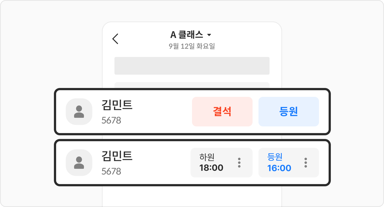 등원 또는 하원 상태 버튼 우측의 더보기 아이콘을 선택 후 시간을 변경해 주세요.