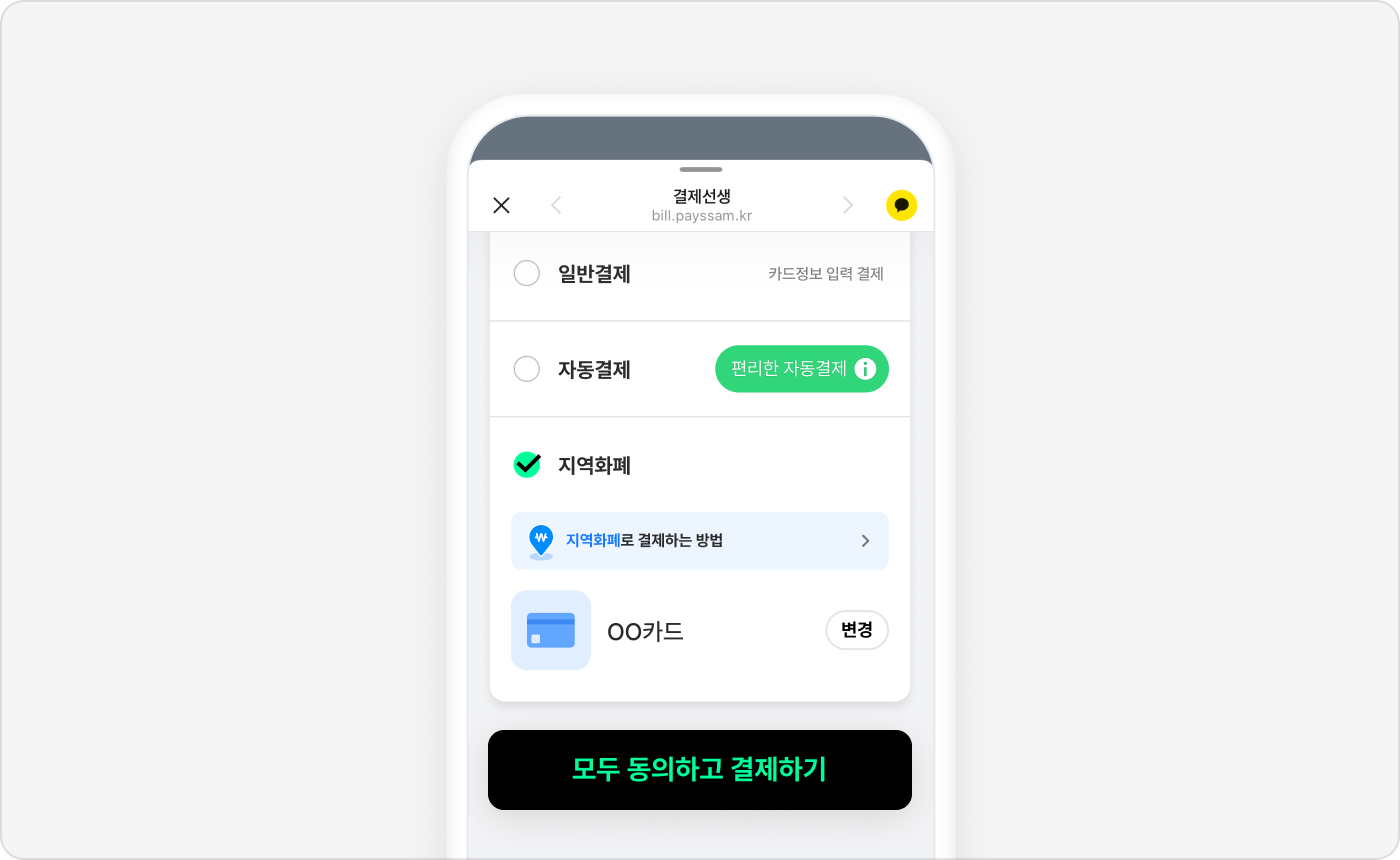 일반결제로 결제 시, 기타 카드를 선택 후 이용할 수 있으며 일부 지역화폐는 운영사 정책으로 인해 결제가 제한될 수 있습니다.