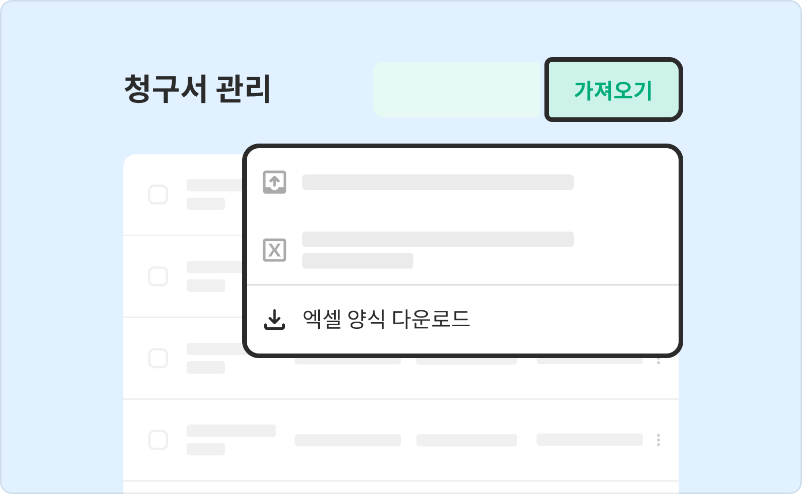 청구서 관리 화면에서 우측 상단의 가져오기 > 엑셀 양식 다운로드 버튼을 클릭해 주세요.