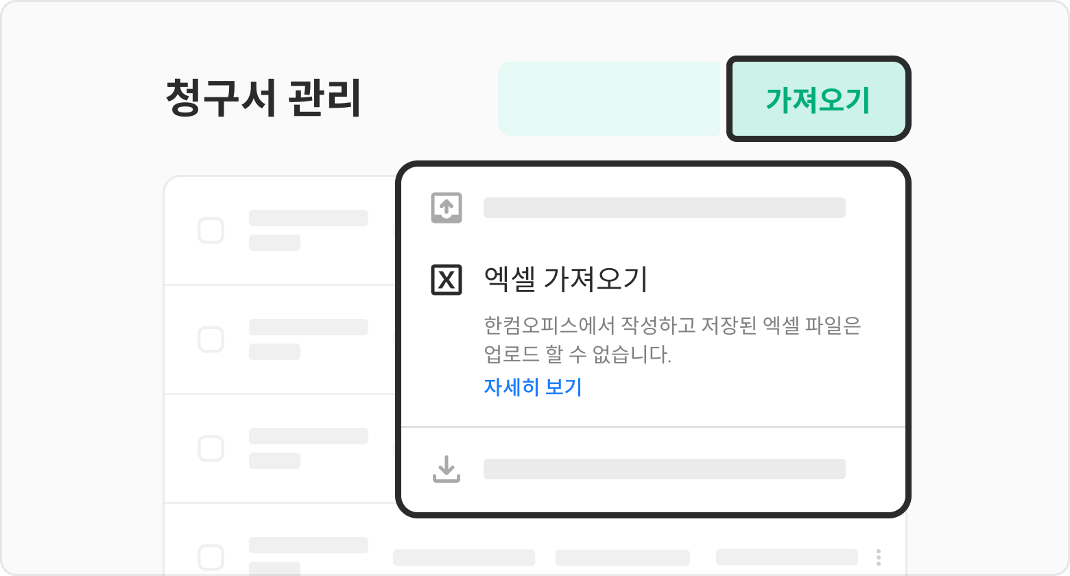 청구서 관리 화면에서 우측 상단 가져오기 > 엑셀 가져오기 버튼을 클릭 후 파일을 업로드 해주세요.