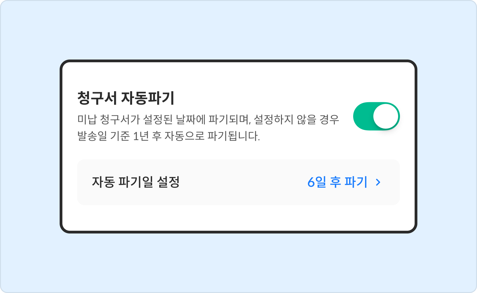 스위치 버튼을 활성화 시켜 사용상태로 변경해 주세요.자동파기일 설정을 선택하여 자동파기일을 설정해 주세요.자동파기일을 설정하지 않을 경우 발송일 기준 1년 후 자동으로 파기됩니다.