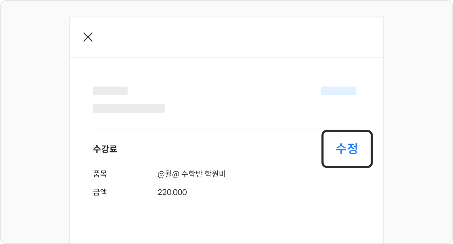 클래스 상세화면에서 오른쪽 상단에수정버튼을 선택해 주세요클래스 수정화면에서 클래스명, 수업 요일, 수강료를 수정할 수 있습니다.수정이 완료되면 하단에