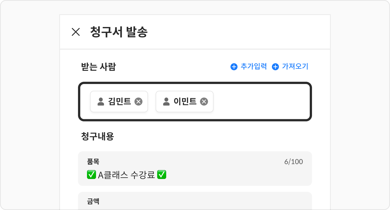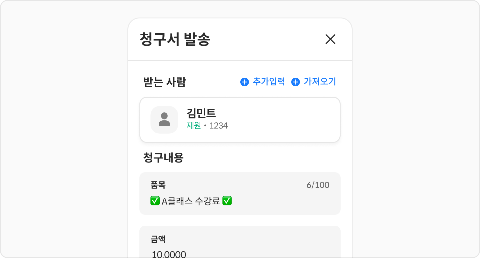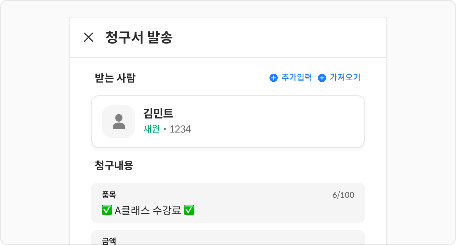 청구서 발송버튼 또는예약버튼을 클릭해 주세요.클래스에 수강료가 등록되어 있는 경우, 자동으로 청구내용이 수강료로 입력됩니다.