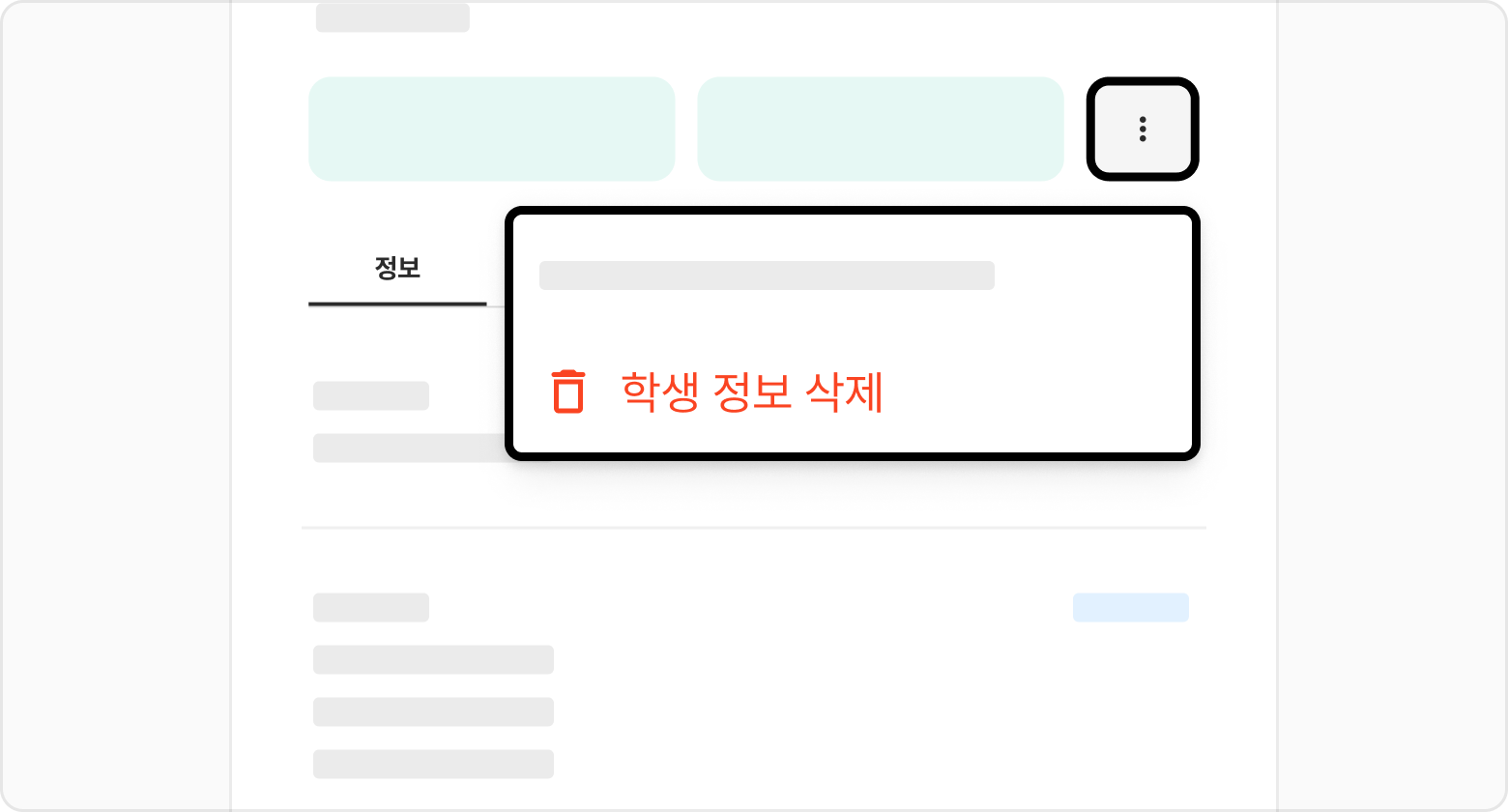 더보기버튼을 선택해 주세요.학생 정보 삭제선택 후 삭제 확인 팝업에서학생 정보 삭제버튼을 선택해 주세요.학생 정보를 삭제하면 학생의 결제, 수납, 출결 내역은 삭제되지 않습니다. 단, 학생에게 예약된 청구서는 자동으로 삭제 됩니다.