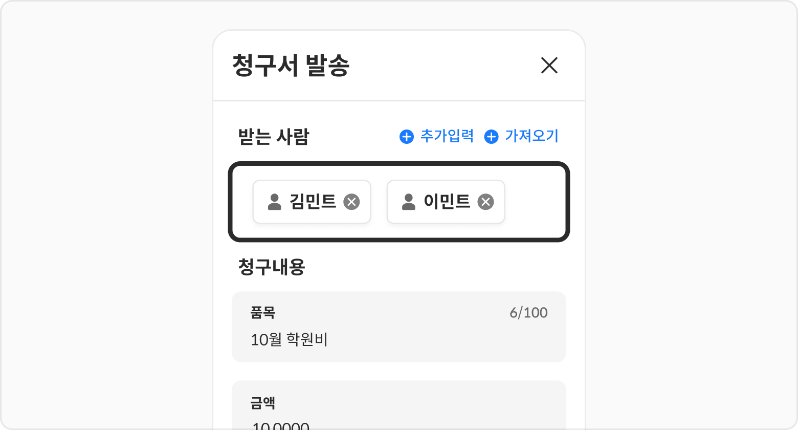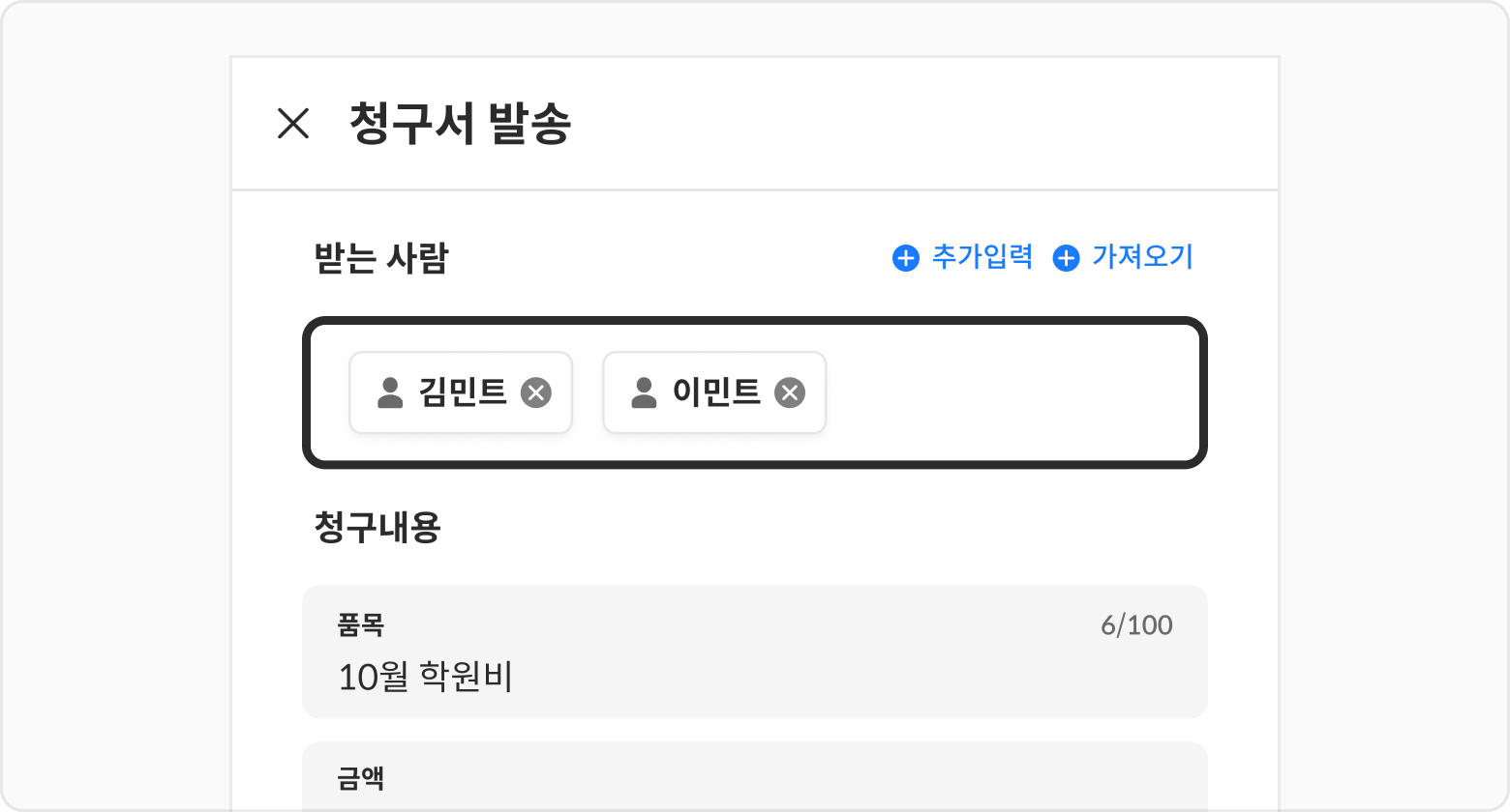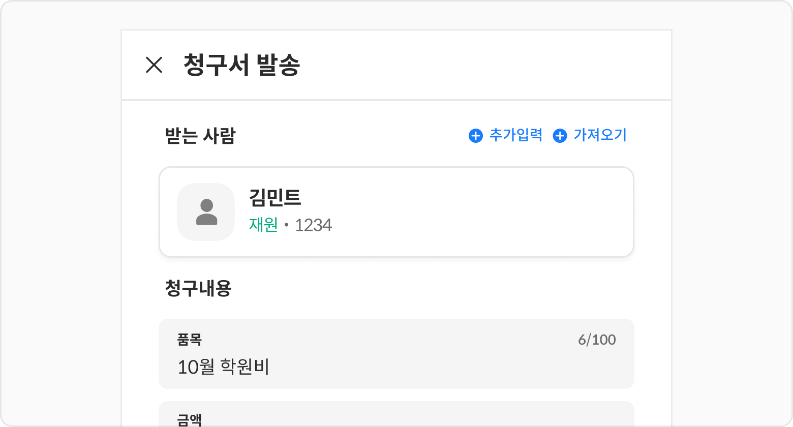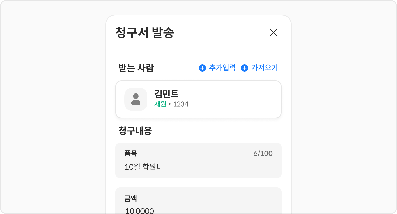 쌤포인트가 부족할 경우 청구서 발송이 불가합니다. 쌤포인트를 충전하고 청구서를 발송해 주세요. 쌤포인트 충전 방법은 쌤포인트 충전 문서를 확인해 주세요.