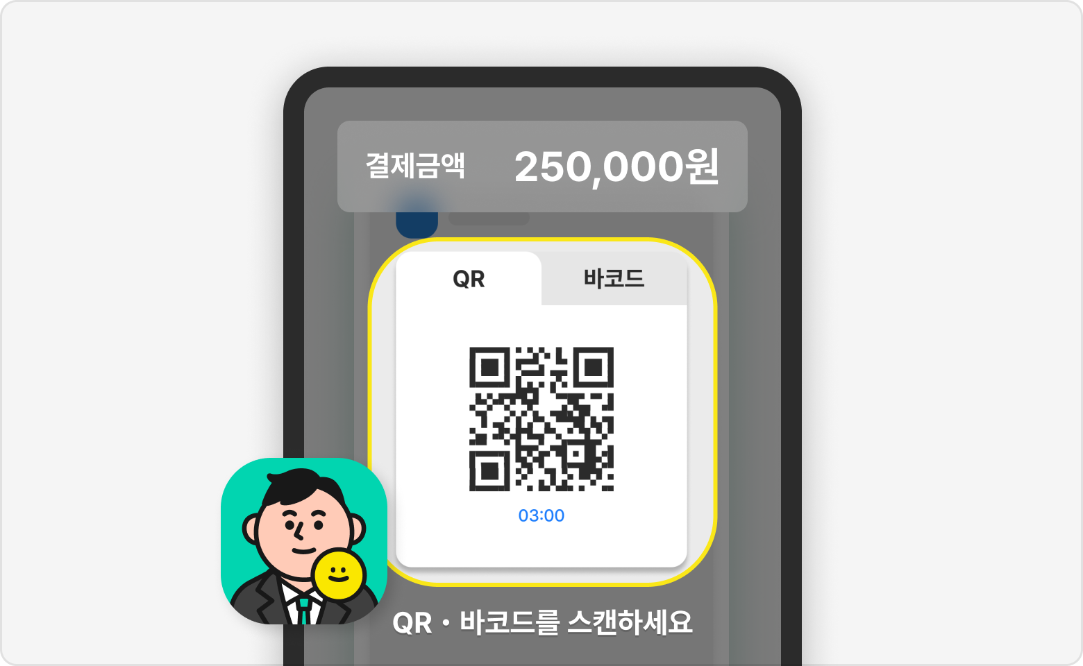 고객이 제시한 QR 또는 바코드를 스캔하고 결제를 진행해 주세요.