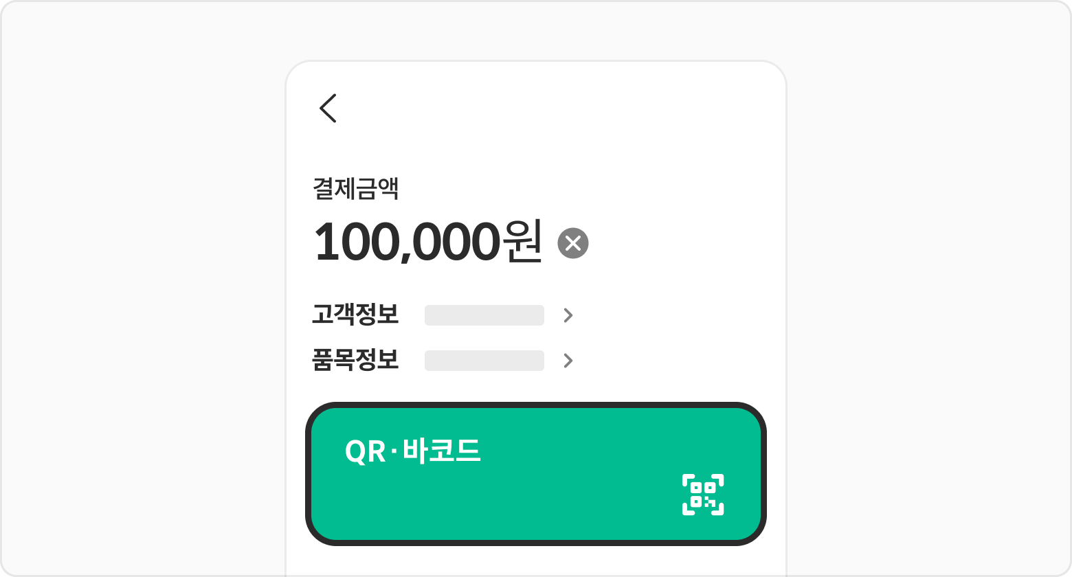 결제금액, 고객정보, 품목정보를 입력한 뒤 QR·바코드 버튼을 선택해 주세요.
